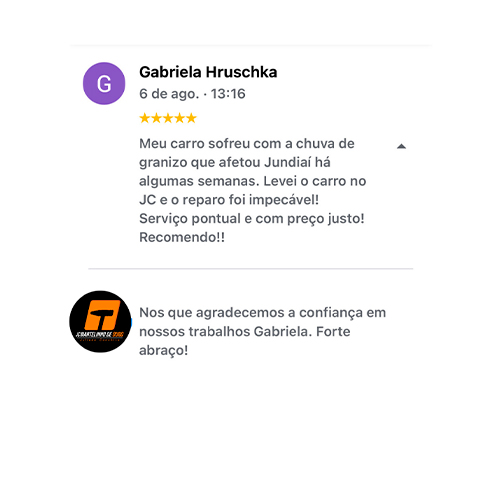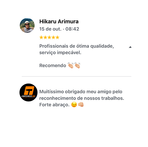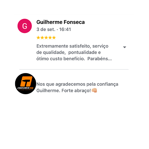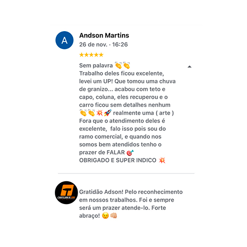 "Serviço realizado de maneira rápida e muito eficiente. Juliano em particular foi muito educado e atencioso. Estou muito satisfeito com o trabalho realizado no meu veículo."
